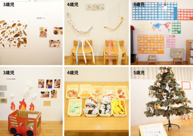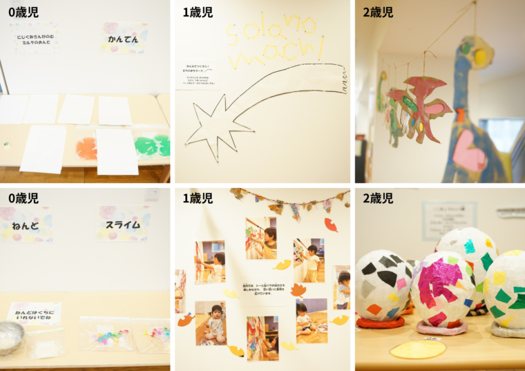 1歳児組では、折り紙をちぎる・貼るといった指先を使う遊びをきっかけに、散歩で出会った自然物への気づきが作品として表現されていく過程を展示。子どもたちの「発見」がそのまま形として広がっていきました。